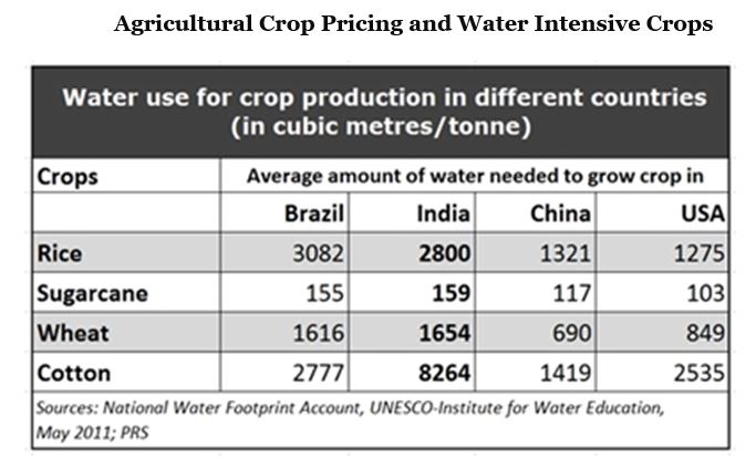 গত ১০০ বছরে, ১৯০০ থেকে ২০০০-এর মধ্যে ফ্রেশ জল ব্যবহারের পরিমাণ বেড়েছে সাত গুণ। এই সময়ের মধ্যে গোটা পৃথিবীর অর্ধেকেরও বেশি নদ-নদী, লেক, পুকুর, বিল-ঝিল বিলুপ্ত হয়েছে। নিশ্চিহ্ন হয়েছে মিষ্টি জলের প্রাণিকুল। ফ্রেশ জলের সিংহভাগই ব্যবহৃত হচ্ছে ইরিগেশনে (৭০%, বিভিন্ন ধরনের ফলমূল, শাকসব্জি, ধান, গম, ভুট্টা, তুলো ইত্যাদি কয়েক গুণ উৎপাদনের কাজে)। কোন ফসলে কতটা জল ব্যবহৃত হচ্ছে, পৃথিবীর কয়েকটি বড় দেশের চার্ট উপস্থাপন করে সেটি দেখানো হলো -