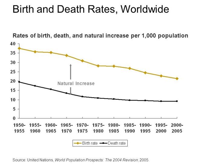 তবে জনবিশেষজ্ঞদের মতে, প্রতি নারীর সন্তান সংখ্যা যদি ২.১-এর বেশি হয়, তাহলে জনসংকোচনের সম্ভাবনা প্রত্যাশিত পর্যায়ে ২১০০ সালের পরেও নেই। কারণ পাশ্চাত্যে জন্মহার সংকুচিত হলেও এখনও পর্যন্ত এশিয়া এবং আফ্রিকার অনেক দেশেই উঁচুতে। এছাড়াও ইউরোপ, আমেরিকায় জন্মমৃত্যুর অনুপাতের মধ্যে দূরত্ব কম হলেও এশিয়া এবং আফ্রিকা মহাদেশে এই অনুপাতে পার্থক্য প্রচুর। সেখানে রাষ্ট্রভেদে মৃত্যুহারের চাইতে জন্মহার কোথাও তিন গুণ, কোথাও বা চার গুণেরও বেশি। অবশ্য ইউরোপ, আমেরিকায় অভিবাসী মায়েদের সন্তানসংখ্যা বাড়ার কারণে জনসংখ্যা সেখানেও নিয়মিত বাড়ছে। ফলে গড়ে জন্মমৃত্যুর আনুপাতিক তফাৎ প্রত্যাশিত পর্যায়ে সংকুচিত হচ্ছে না। ১৯৫০ থেকে ২০০৫ পর্যন্ত বিশ্বব্যাপি জন্ম-মৃত্যুর অনুপাত বোঝাতে একটি তথ্য নিচে সংযোজন করা হলো।