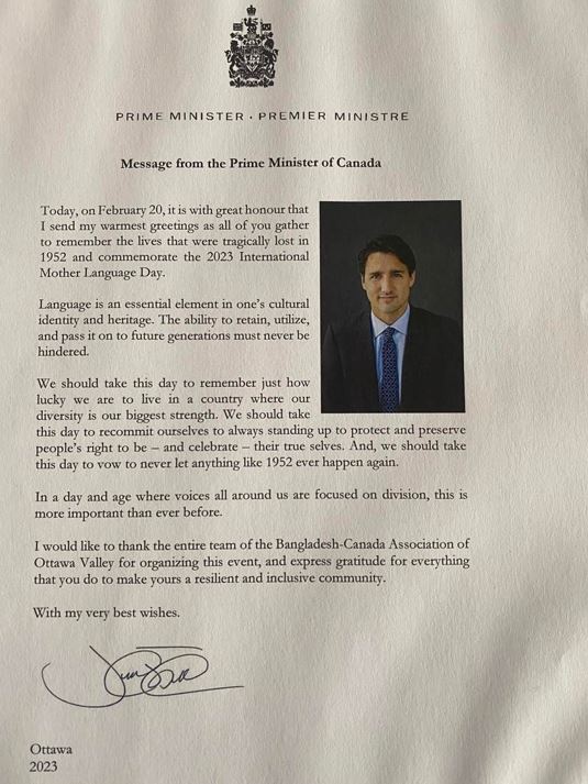 ২০শে ফেব্রুয়ারি, ২০২৩ রাত ১০টা ৩০ মিনিট থেকেই অটোয়ার সাংস্কৃতিক অঙ্গনের প্রিয় একটি কেন্দ্র “ব্রনসন সেন্টার” স্থানীয় বাংলাদেশি-কানাডিয়ানদের উপস্থিতিতে ভরপুর হতে চলেছে। উদ্দেশ্য, রাত ১২টা ০১ মিনিটে, অস্থায়ীভাবে নির্মিত “শহীদ মিনার”-এ পুষ্পার্ঘ্য অর্পণের মাধ্যমে, ১৯৫২ সালে মায়ের ভাষা – বাংলা ভাষা – রক্ষার তাগিদে নিজেরদের জীবন বিলিয়ে দেওয়া ভাষাশহীদ, সালাম, জব্বার, রফিক, বরকত, শফিকুলদের স্মৃতি আর আত্মত্যাগের প্রতি সম্মান করা। [অস্থায়ী] শহীদ মিনারের পাদদেশে ফুল দেওয়া এবং শহীদদেরকে শ্রদ্ধাভরে স্মরণের আয়োজন সেই দুপুর থেকেই শুরু হয়েছে। কাঠ দিয়ে তৈরি করা হয়েছে বাঙালি জাতির অতি পরিচিত এবং গর্বের আর প্রেরণার প্রতীক আমাদের “শহীদ মিনার” যা এখন বিশ্বের বিভিন্ন ভাষা রক্ষার আন্দোলনকারী কর্মীদের প্রেরণার উৎস।