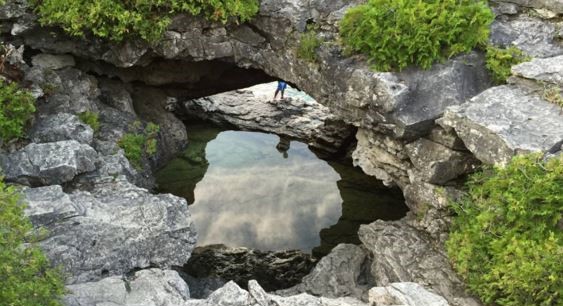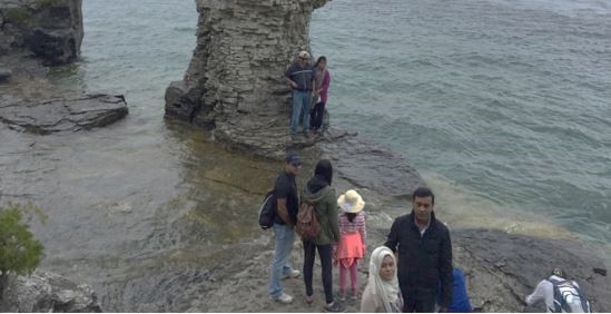 টোবারমরি থেকে মাত্র বিশ মিনিট গাড়ী চালিয়ে আমরা এসেছি ব্রুস পেনিন্সুলা ন্যশনাল পার্কে। গহীন অরণ্যের বেশ খানিকাটা পথ পাড়ি দিয়ে এসেছি পার্কের অফিসে এবং তারপর টিকেট নিয়ে এলাম পার্কিং এ। তারপর স্ব দলবলে প্রায় আধঘণ্টা হাইকিং করে আমরা পৌছালাম অন্য এক ভুবনে। এ যেন এক অচেনা ভুবন, অন্টারিও কিংবা ক্যানাডার কোন জায়গা নয়, বরং মনে হয় ক্যারাবিয়নে এসেছি। খাড়া পাহাড় থেকে সারে বারশ ফুট নিচে গাঢ় নীল কিংবা ফিরোজা রঙের পানি দৃশ্যমান হয়। আমরা ছোট বড় সবাই পাহাড়ের ঢাল বেয়ে নিচে নেমে গেলাম একটি অদ্ভুত সুন্দর খাড়িতে। চারিদিক বেশ উঁচু পাহাড়ে ঘেরা আর মাঝখানে বিশাল এলাকা জুড়ে এই উপবৃত্তাকার খাড়ি। এটিকে বলা যায় একটি বিশাল আকারের প্রাকৃতিক সুইমিং পুল। এক বিন্দু ময়লা নেই কোথাও, পানি খুবই স্বচ্ছ এনং নীল, তবে হিম-শীতল। তবে উপসাগরের মিঠা জলে জলকেলির লোভ সামলাতে পারলাম না আমরা কেউই। প্রথমে মিল্টন ভাই, তারপর ইভান এরপর ছেলে মেয়ে সবাই নেমেছে পানিতে। ঠান্ডার ভয়ে শুধু বাকি থাকলাম আমি। কিন্তু উপায় নেই শেষটায় নামতে হলো আমাকেও। আর নেমেই দাঁতে দাঁত চেপে প্রচণ্ড এক সাঁতারে চলে গেলাম বিশ গজ দূরে। কিন্তু বিপত্তি বাঁধল ফিরতে, ঠান্ডায় প্রায় জমে যাচ্ছিলাম। তাও কোন আওয়াজ করলাম না, কোন ভাবে নিজের মান সম্মান নিজেই রাখলাম। কিন্তু সমস্যা হলো শাহীনের বেলায় – আর একটু থাকলে হয়ত সলিল সমাধি হতো। ভাগ্যিস সবাই বুঝতে পেড়ে টানাটানি করে পাড়ে এনেছিল। পরে যদিও ভয়ে আমাদের কেউ কেউ আর সাঁতারই দেয়নি।