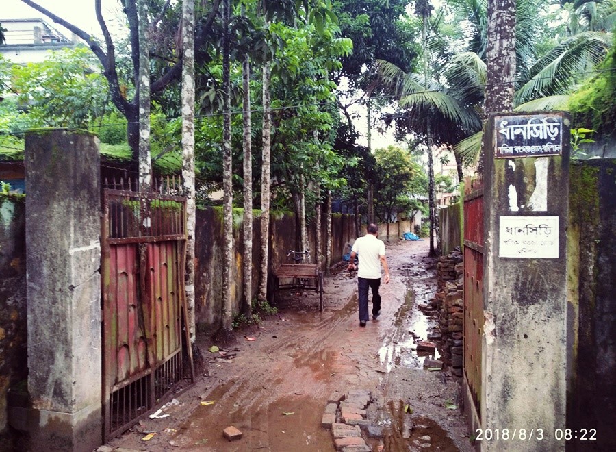 পরিশেষে পাওয়া গেলো 'ধানসিড়ি, পশ্চিম বগুড়া রোড' ফলক সম্বলিত কাংখিত সেই বাড়ির গেট। গেটের পিলার দুটো না থাকলে হদিসও পাওয়া যেতো না জীবনানন্দ দাশের বসত ভিটার। কিন্তু গেট পেরিয়ে ঢুকছি তো ঢুকছি। কোন স্থাপনা তো নাই! আছে এক এঁদো ডোবা। কলাবতী ফুল রঙ ছড়াচ্ছে সেখানে। পুকুরের ওপাড়ে সময় সময় যেমনে মন ধরে তোলা টিনের দোচালা, চৌচালা ঘর।