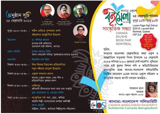 আগামী শনিবার, ২৫ ফেব্রুয়ারী ২০২৩ এ কানাডা-বাংলাদেশ সলিডারিটি আয়োজিত ১১ তম কানাডা একুশে বইমেলায় ( 8200 St Laurent Blvd. Montreal,QC, H2P 2L8) শিরীন সাজি এবারকার প্রকাশিত বই এবং পূর্বে প্রকাশিত বই নিয়ে মেলার স্টলে উপস্থিত থাকবেন( দুপুর বারোটা থেকে রাত দশটা)।